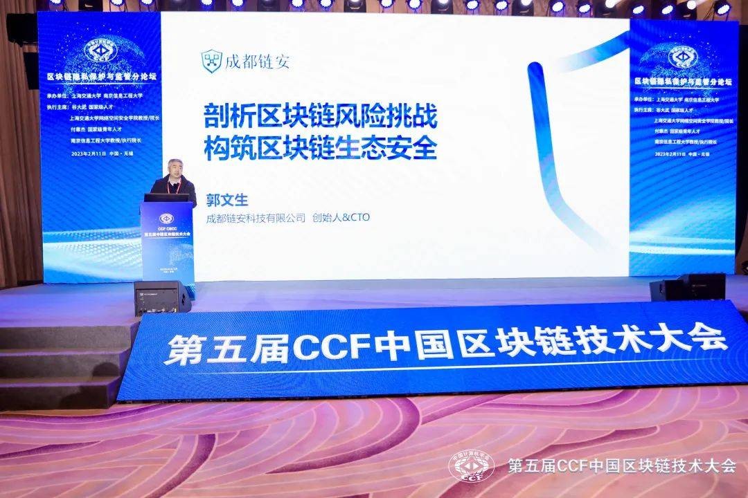 2月10-12日,由中国计算机学会主办的,2023年国内首场大型区块链学术会议—第五届CCF中国区块链技术大会在无锡市成功举办,成都链安作为区块链安全头部企业受邀参加此次大会。大会上,成都链安创始人&CTO郭文生教授与锡东新城商务区签署双方战略合作协议,并在区块链隐私保护与监管分论坛上进行了《剖析区块链风险挑战,构筑区块链生态安全》的精彩主题分享。