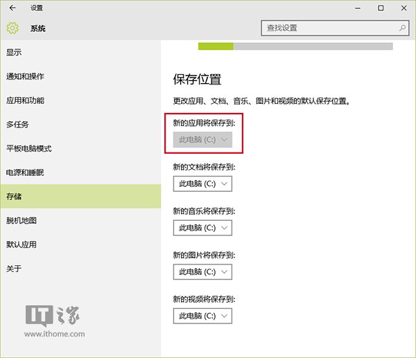 进入设置→系统→存储后会发现,“新的应用将保存到”下面无法更改。也就是说,目前Windows应用只能保存到系统盘(C盘)。很多用户都知道C盘空间比较宝贵,一旦空间吃紧,用起来各种麻烦。如果能够把应用存放到其他分区,这会给C盘减轻很多压力,尤其是硬盘空间有限的老旧设备,以及某些入门级平板设备,如果能够启用这项设置,新系统的日子将会好过得多。