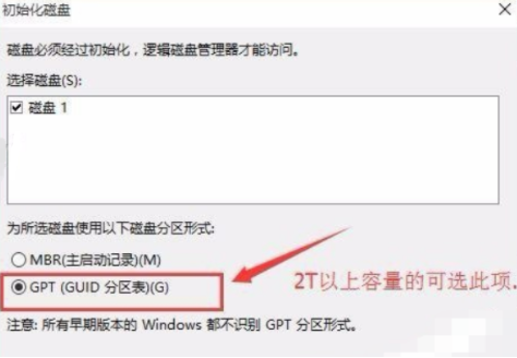 4、如果有未初始化的硬盘,就会自动弹出初始化的提示,总容量小于或等于2TB的硬盘,分区表可以选择MBR。大于2T的可以选择gpt分区形式,不过要注意BIOS是uefi引导模式。选择好后点击确定,再进行分区就可以正常使用啦。