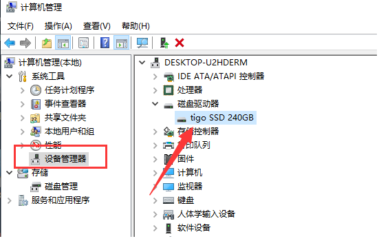 2、打开计算机管理后,点击左侧的设备管理器,查看磁盘驱动有没有安装,尝试进行更新一下驱动。