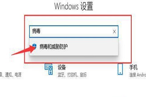 2、打开设置后,不用一步一步的找,直接在搜索框中输入“病毒”,点击下方弹出的关键词“病毒和威胁防护”;