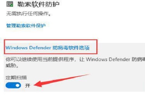 4、最后,也是重要的一个,在病毒和威胁防护界面中,拉到最下方有一个“windows Defender 防病毒软件选项”,点击此选项,并把下方的“定期扫描”也关闭就完成了。