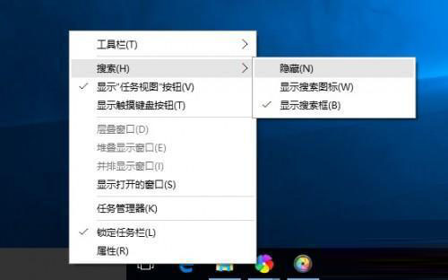 3、如果经常要用到搜索框,但又觉得Win10任务栏搜索框太长,我们则可以选择仅“显示搜索图标”,这样就看着舒服多了,如下图。