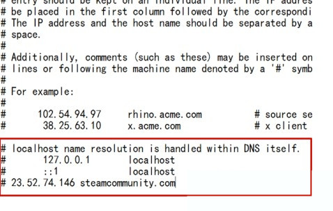 4、在hosts內容最下边键入下面的图白框中的內容,随后保存修改,改动进行后重启一下计算机应当就可以一切正常打开steam社区了。
