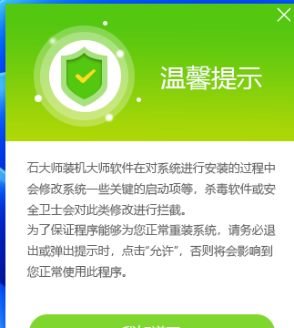 在正常的电脑上下载打开石大师重装系统客户端,软件将会弹窗提醒使用此软件前请将杀毒软件关闭。