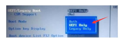2、boot启动选项下方可以看到有“LEGACY only”、“UEFI only”和“UEFI and LEGACY”三种选项,选择uefi选项即可,按下F10保存退出重启电脑即可。