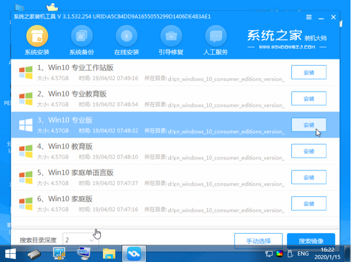 (2)进入PE系统,打开系统之家一键装机工具,搜索镜像文件,会有ghost win10专业版系统的镜像文件出现,点安装;