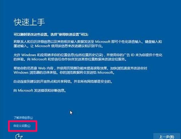 7、接着就是快速上手,因为是Ghost版系统,所以,最好自已手动设置,关闭一些默认的启动项目,所以按“自定义设置”,不要选择“使用快速设置”。
