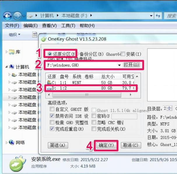 3、打开“安装系统.exe“,把高级选项也打开,其整体界面如下,在这个界面,其余的选项默认就好,只要操作如下四步: