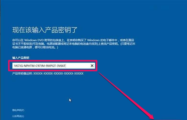 6、重启后,进入开始Win10安装过程,第一步,肯定是填写产品密钥,Ghost版系统,一般会在压缩文件内提供产品密钥,如果没有提供,在下载页面也会有提供,我的就是从下载页面找到的,这个密钥, 要在安装Win10之前就要准备好,可以提前写在纸上,安装时要填,要是没有,就哦豁咯。填好产品密钥之后,点击下一步。