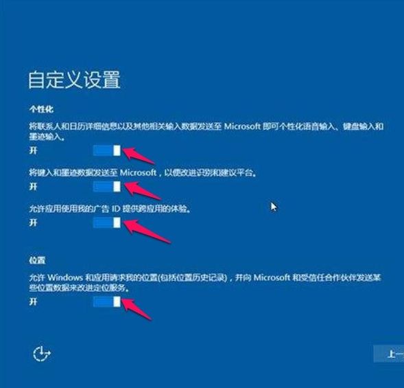8、第一个设置页面,在这里,有四个设置项,反正我都把它们关掉了,如果是平板电脑,这个“位置”不一定要关,可能影响使用,按“下一步”。