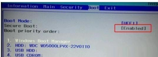 5、进入BIOS后我们可以看到上方有几个选项,一般ecure Boot会在Security或者boot菜单下,找到后将其修改成“Disable”即可。