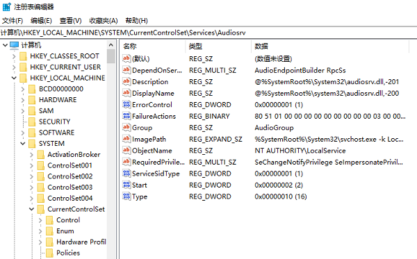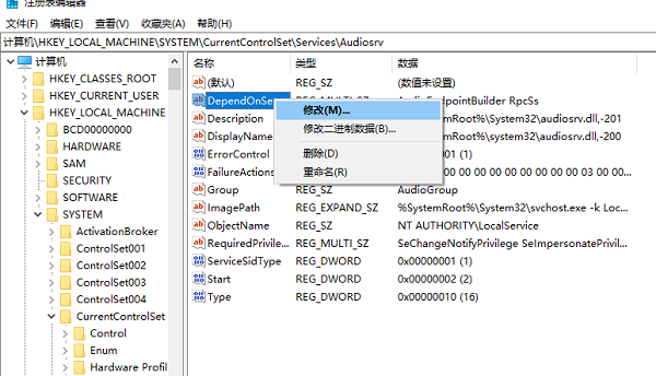 2、进入后依次点击,找到并点击HKEY_LOCAL_MACHINE\SYSTEM\CurrentControlSet\Services\Audionsrv,DependOnService。