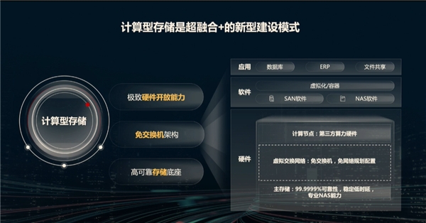 计算型存储以高可靠的主存储为基础,具备丰富的专业存储特性和独有SAN&NAS一体化能力,提供99.9999%可靠性和稳定低时延;免交换机架构,通过弹性虚拟网络预置内部网络,实现网络规划免配置;通过极致的硬件开放能力,多样化算力灵活选择,为伙伴和客户提供一站式“超融合+”建设方案,为分支边缘多种应用提供简单易用的基础设施。