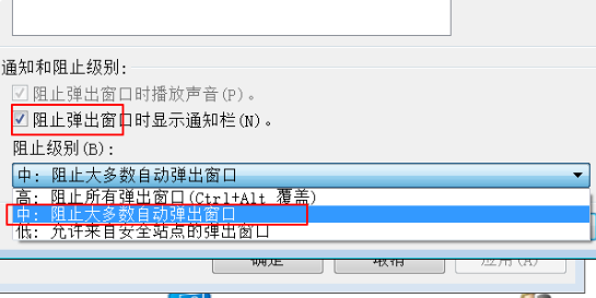 4、在设置的页面中,我们勾选阻止弹出窗口时显示通知栏,然后阻止级别设置为“中:阻止大多数自动弹出窗口”即可。