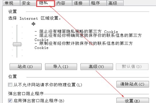 3、在Internet选项的属性里,选择“隐私”选项,再将下方的启用弹出窗口阻止程序前面的方框勾选上,点击“设置”。