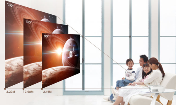 决定了投射画面大小,投射比=投影距离/画面宽度,投射比越小可实现范围越大,如今市面上主流的投影仪投射比大多为1.2:1,指的是投影距离1.2m内,可投射1m宽的画面。如果是想投射100寸的屏幕,所需距离大约为2.6m。