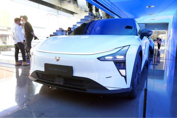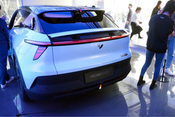 首先在外观方面,ROBO-01的整体设计十分的简洁,流线型的车身造型,线条非常流畅,几乎没有任何棱角,特别是前脸部分有一种圆润的感觉,车顶部分则是采用当下新能源车流行的遛背式造型。也正是得益于这种设计,ROBO-01的风阻系数仅为0.249,可以有效降低高速行驶中的空气阻力,对于车辆的续航表现非常有帮助。