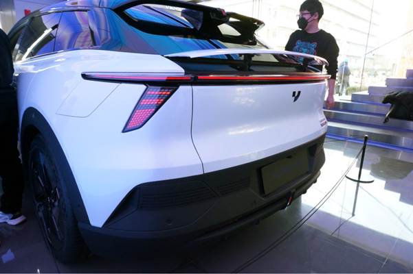 车尾部分的设计同样简洁,贯穿式的尾灯,下侧是与车头呼应的带有灯语功能的像素灯组,晚上点亮之后还是非常具有辨识度的。另外车尾部还配备了一个主动升降尾翼,可以根据不同驾驶状态,由AI自适应调节,使车身获得优异的空气动力学性能。高速行驶时,车辆会自动升起主动尾翼以增强下压力;当车速下降的时候,主动尾翼自动收回,降低风阻。