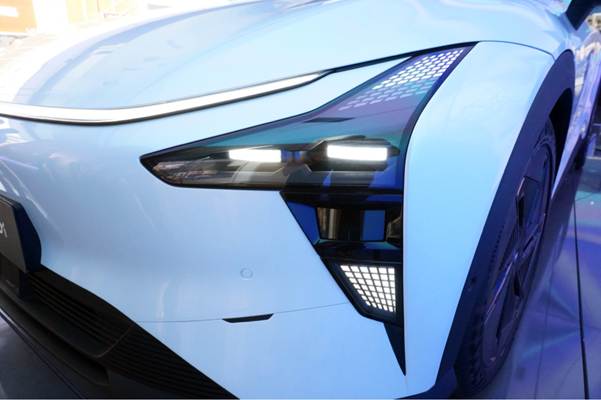 ROBO-01车灯部分设计十分特别,不但把激光雷达巧妙的融入进整个灯组里,同时还在上下两边布置了交互式AI像素大灯,支持交互式的灯语,这点还比较特别。除此之外,在车头正前方还有一条贯穿式的日行灯,不过没有和大灯组连为一体,是独立式的。
