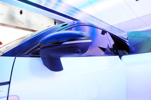 来到车侧部分,可以看到ROBO-01的四个车门都没有常规的门把手,哪怕现在电动车流行的隐藏式门把手都没有,而是采用了4扇电动车门,开门按键则安排在了B柱和C柱上面,车门都配备了毫米波雷达,可以自动探测车门开关的角度,防止碰到旁边的物品和行人。除了按键以外,这辆车还设计有包括UWB钥匙、蓝牙、NFC、语音等多种的开闭门的方式。