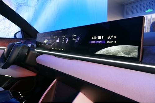 ROBO-01上面的中控屏是这辆车的亮点之一,它并不像其他车型上是两块或者三块屏幕连在一起组成的大连屏,中间会有边框区隔。而这块屏幕是一整块大屏,尺寸达到了35.6英寸,分辨率达到了6K,显示效果非常的细腻,同时界面的UI设计也非常的炫酷,可以显示非常多的车辆信息。