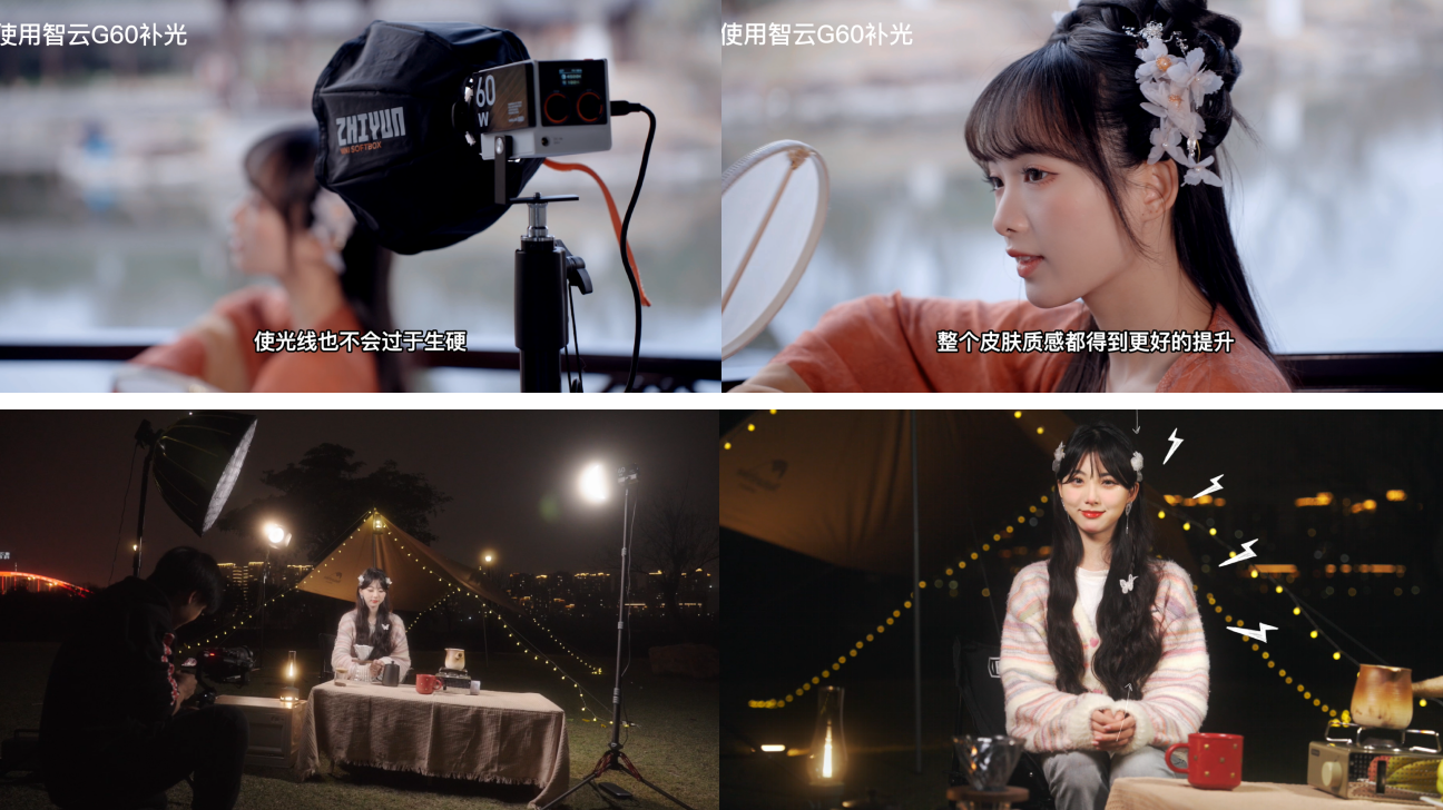 直播、TVC、MV拍摄和采访等场景对于光照的要求颇为严格,均需要对人物补充不同角度的面光,体现人物美感,同时也要打亮环境,营造真实自然的拍摄环境。常见的直播场景,我们需要使用到环境光、背景光、逆光和面光,至少需要4组大功率主光灯源,充分弥补光线不足和人物暗光死角问题。得益于智云功率王G60的魔方大小体积,很轻易就能在桌面放置三脚架,布置人物面光,在背景收纳柜上就能安排逆光,配合灯架使用,架高在顶部也能非常轻松布置环境光,掌上小巧的体积给了影视灯更多创作可能,足够满足商业大场景需求。