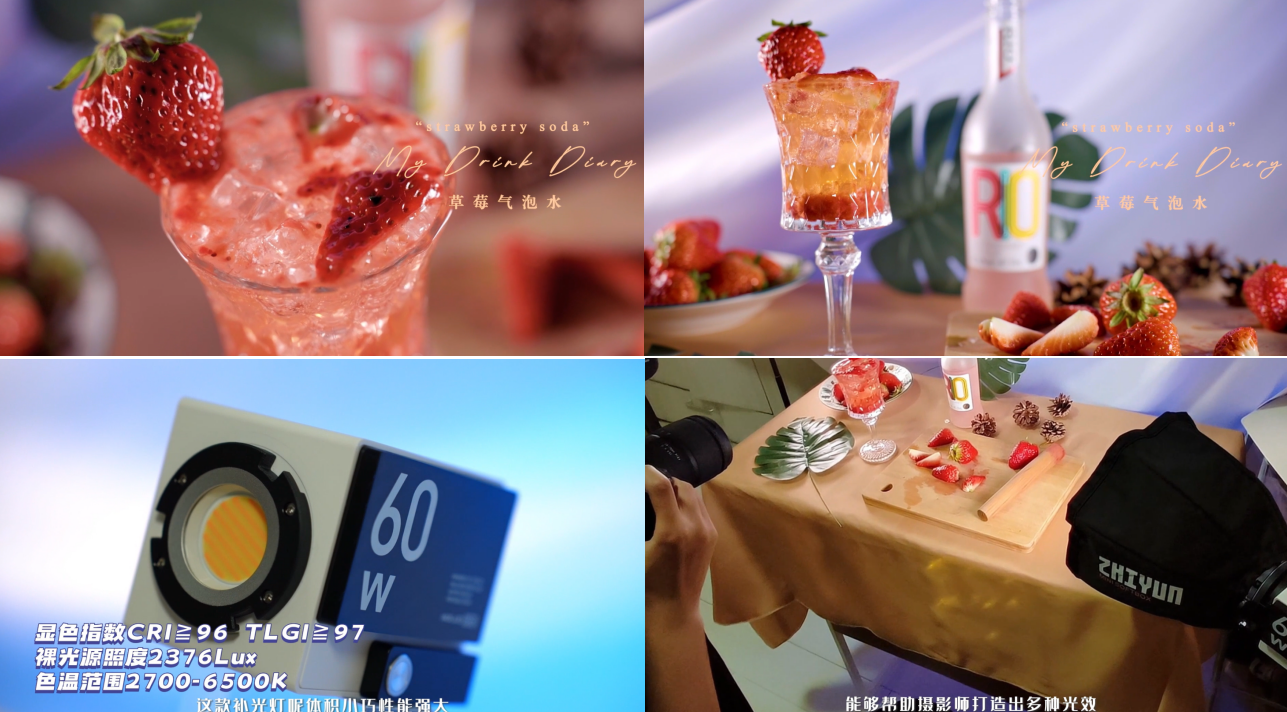 无论是玻璃制品、水果美食还是数码产品都常需要拍摄广告特写,室内影棚或工作室能更好控制光影,专业摄影师常使用高显色影视灯和100mm左右的微距镜头拍摄静物,直出效果极佳;智云功率王G60这款影视灯显色指数达到96以上,具备商业摄影的专业素质,同时小体积足够在各种空间工作室快速搭建灯组,配合智云ZY卡口控光附件,能定点拍摄静物细节,比如,55°标准罩硬光可以突出产品阴暗面,也能使用柔光罩、柔光球自然拍亮整个产品,多灯协作就能大幅提高商品的设计质感,高级且梦幻,达到商业推广目的。