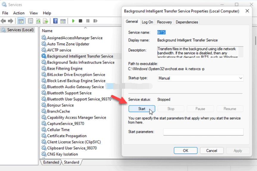 BITS 或后台智能传输服务直接负责在计算机上运行 Windows 更新服务。如果此特定背景服务有任何问题,您将获得上面提到的错误代码。因此,您可以重新启动服务以解决此类常见问题。为此,做好以下工作: