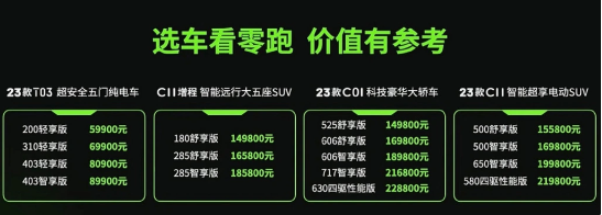 据本站了解,零跑汽车是一家新能源汽车制造商,旗下拥有四款车型,包括2023款零跑T03、2023款零跑C01、零跑C11纯电版和零跑C11增程版。其中,2023款零跑T03的指导价在5.998.99万元之间,2023款零跑C01的指导价为14.9822.88万元,零跑C11纯电版的指导价为15.5821.98万元,零跑C11增程版的指导价为14.9818.58万元。