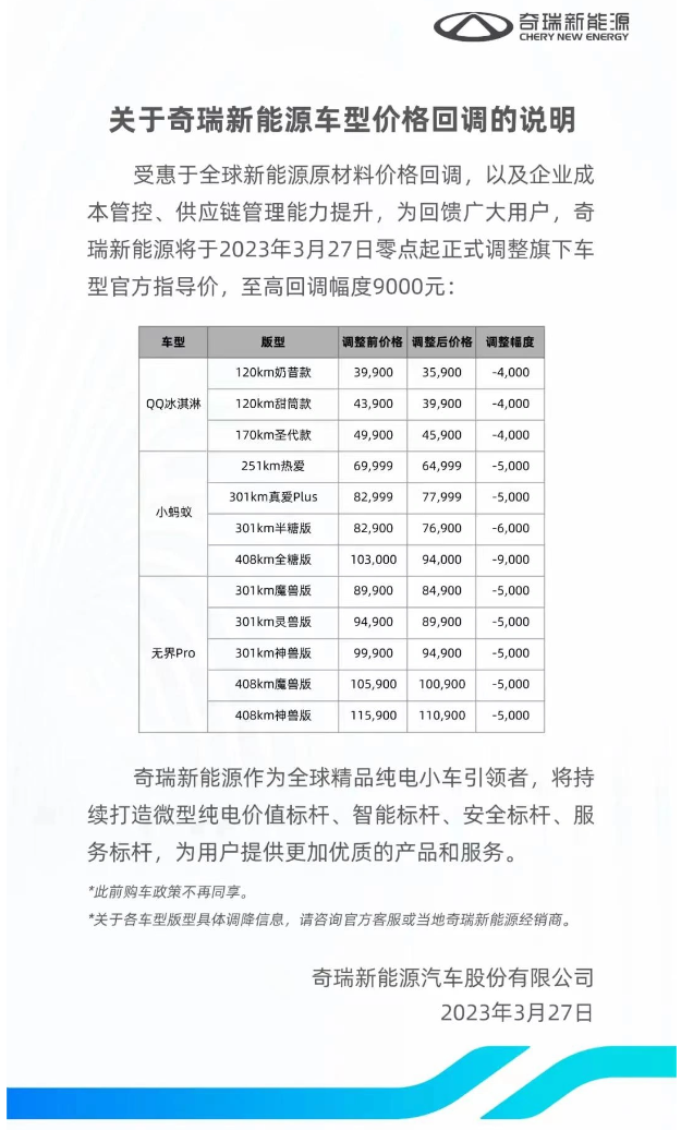 【本站】3月27日消息,奇瑞新能源汽车股份有限公司宣布,将于今日零点起,正式调整旗下车型官方指导价,最高回调幅度达9000元。据悉,此次调价受惠于全球新能源原材料价格回调,以及企业成本管控、供应链管理能力提升。