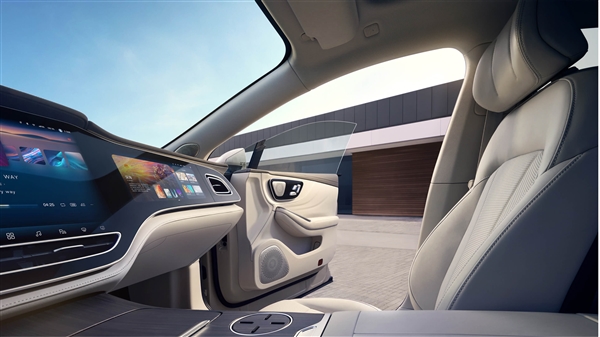 内饰方面,飞凡F7采用了对称式设计,中控台看起来像是一整块面板,左中右分别配有三块液晶屏幕,组成RISING MAX巨幕43英寸三联屏。方向盘也采用了类似中控造型的设计,并采用双色配色。中控区域下方,还有一个巨大的储物空间,兼顾实用性。后排提了一个8英寸的娱乐屏,后排屏幕不仅能控制座椅和多媒体系统,还可播放视频。