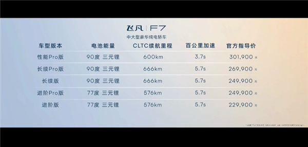 【本站】3月28日消息,飞凡F7正式上市。该车共推出6款车型,售价区间为20.99万-30.19万元,定位纯电中大型轿车,提供单电机、双电机及换电车型。据了解,这款新车的综合续航最高可达666km,电池容量有90kWh、77kWh三元锂电池以及64kWh的磷酸铁锂电池,不过售价最低的磷酸铁锂版将于今年下半年上市。