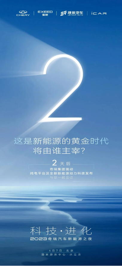 【本站】4月5日消息,奇瑞汽车宣布将于4月7日在北京水立方举行“科技・进化——2023奇瑞汽车新能源之夜”,届时将带来多项新能源汽车相关内容。