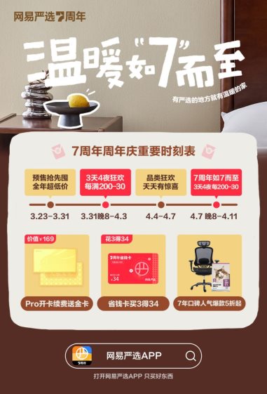 据悉,此次严选周年庆活动以“温暖如7而至”为主题,在3月23日至4月11日期间推出省钱卡、7年口碑爆款5折起、Pro会员开卡续费送金卡等优惠活动。