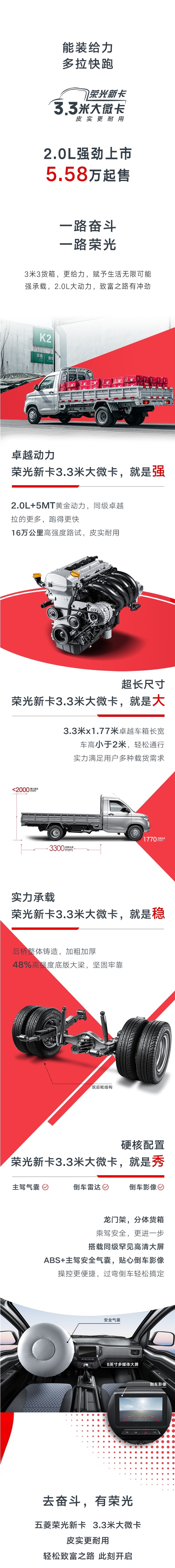【本站】4月13日消息,五菱汽车官方宣布,全新荣光新卡已经上市,售价5.58万元起。作为一款大微卡车型,荣光新卡提供单排和双排两种布局,这次上市的是新增车型,搭载2.0L发动机和5MT的动力组合,同级性能强劲。此外,该车拥有3.3米的超大货厢,宽1.77米,深360毫米,可以满足多种载货出行需求,车高小于2米,地库也能进。