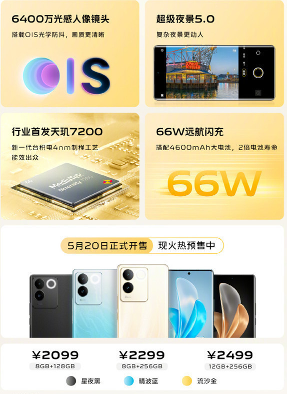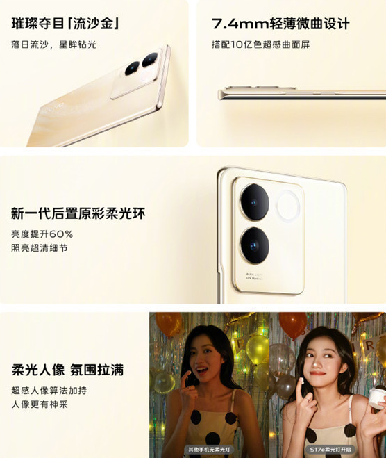 此外,vivo S17e在外观上也进行了全新设计。手机采用了全新水镜云窗设计,呈现出独特的外观风格。其中,"流沙金"配色采用了纳米级三纹镀膜技术,使机身呈现出落日余晖下的黄金海滩效果,细腻的金沙流淌出柔和的肌理,给人一种高级质感的视觉享受。此外,vivo S17e还提供星夜黑和晴波蓝两种配色可选,满足用户的不同需求。