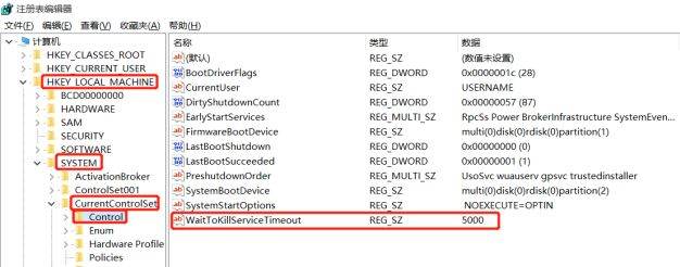 HKEY_LOCAL_MACHINE\SYSTEM\CurrentControlSet\Control,并找到右侧的WaitToKillServiceTimeout