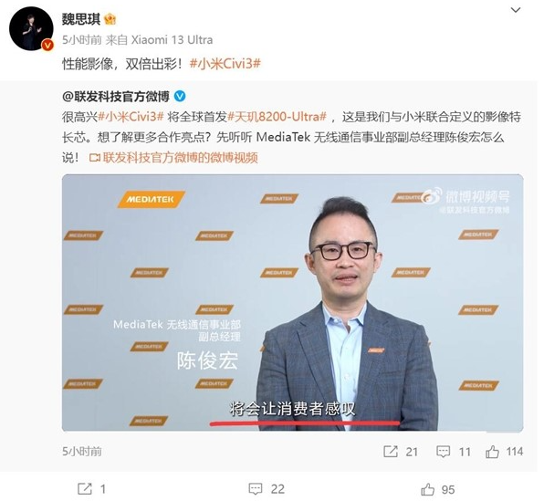 【本站】5月19日消息,小米手机官方近日正式宣布,全球首发的小米Civi 3将于近期推出。这款手机是小米Civi系列的最新成员,备受用户关注。最引人注目的是,小米Civi 3将首次搭载联发科天玑8200 Ultra芯片,代表了小米和联发科的合作迈向新的里程碑。此前的小米Civi、小米Civi 1S和小米Civi 2都采用了高通芯片,而此次搭载联发科芯片的决定引起了广泛关注。
