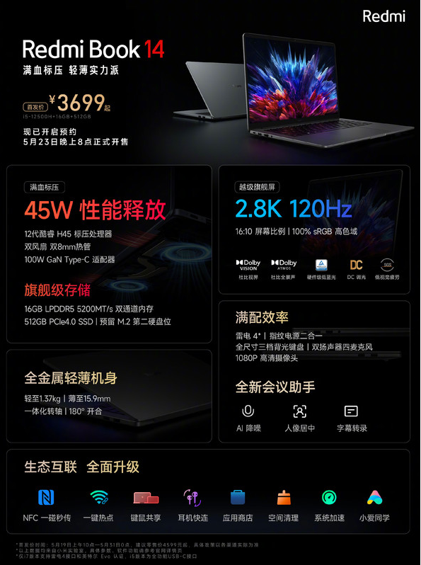 Redmi Book 14的屏幕是其亮点之一,拥有2.8K分辨率的高色域屏幕。该屏幕支持120Hz刷新率,同时还具备杜比视界、杜比全景声、硬件级低蓝光和DC调光等功能,为用户提供出色的视听体验。这样的屏幕配置在轻薄本中相当引人注目。