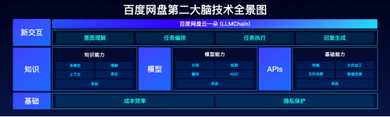具体来讲,第二大脑技术架构包括三层,交互层基于文心大模型打造的LLMChain,具备自然语言交互能力;能力层包括知识、模型与APIs,知识将多模态的文件转化为各个场景的知识,模型是整合了百度的AI技术与基于网盘场景闭环优化的模型能力,比如分类、检测和美化等,APIs是网盘的基础数据处理能力,包括基础的传输存储等;基础层的成本效率,发布了行业领先的磁带存储用户在线数据的分级存储架构,实现极致的精细化存储效率。