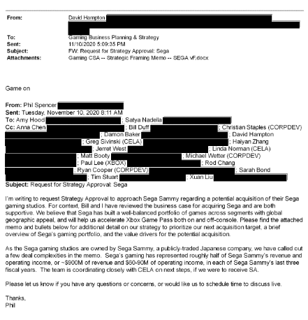 据了解,微软的Xbox部门负责人菲尔·斯宾塞在2020年曾向公司CEO萨蒂亚·纳德拉和CFO艾米·胡德发送了一封内部邮件,请求他们批准与世嘉的母公司Saga Sammy进行接触,探讨收购可能性。邮件中指出,微软认为世嘉已经在游戏市场上建立了一个平衡的游戏组合,涵盖了不同的细分市场,具有全球地理吸引力,将有助于加速Xbox Game Pass在主机内外的发展。