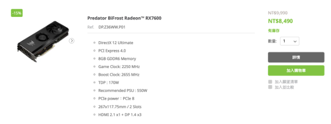 据宏碁官网显示,这三款Predator BiFrost品牌显卡在设计上相似,而旗舰型号A770更是加入了RGB灯效。而A770的售价为11900新台币(约合2749元人民币),A750售价为7990新台币(约合1846元人民币),RX 7600售价为8490新台币(约合1961元人民币)。