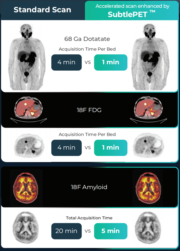 据介绍,作为一种突破性的解决方案,SubtlePET独有的去噪算法,能在不损失图像质量和诊断准确性的情况下减少成像时间,做到影像质量提升、降噪和提升分辨率。对于等医疗机构而言,SubtlePET能在医院、影像中心的任何品牌的扫描仪上实现更快的PET成像,最新的SubtlePET 2.0版本涵盖了PSMA(前列腺)癌症放射试剂、阿尔兹海默病的Amyloid淀粉样蛋白核素等多款放射性示踪剂,并提供了更好的性能,可以更好的赋能精准医疗和诊疗一体化应用。