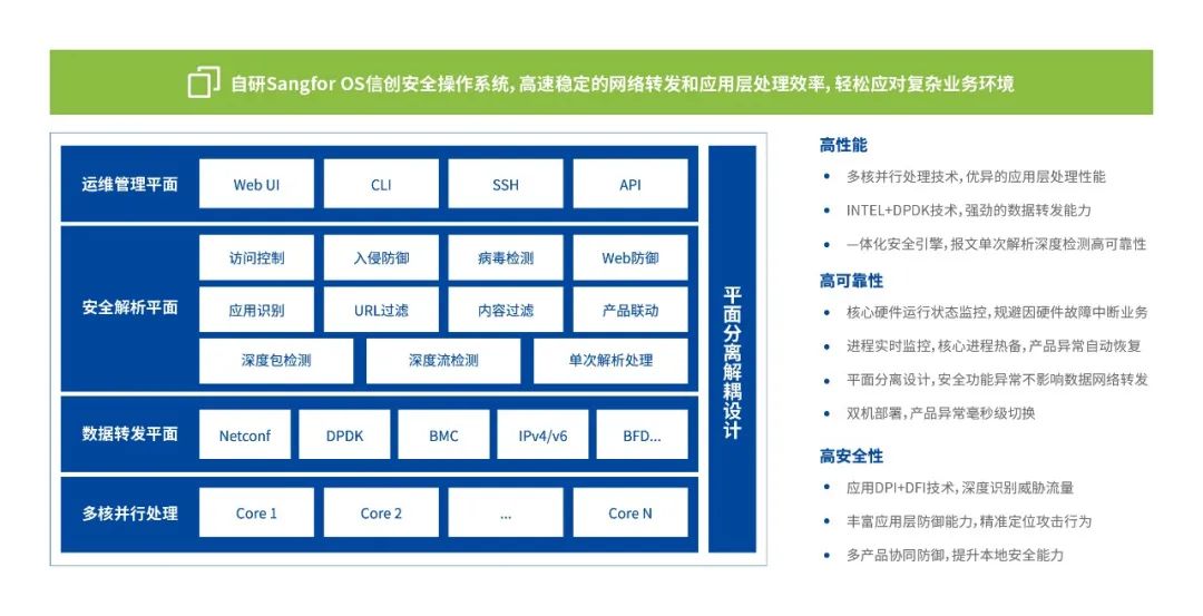 性能领先:软件定义可靠,通过创新驱动软件优化,保持信创环境下性能领先。如:自研Sangfor OS,文件系统读写性能提升20%,页表大小减少93%,内存占用降低30%;信创版本软件优化,整体性能提升20%~30%以上,部分产品性能可提升50%;零信任产品拥有国内唯一百万并发实践,性能大幅领先。