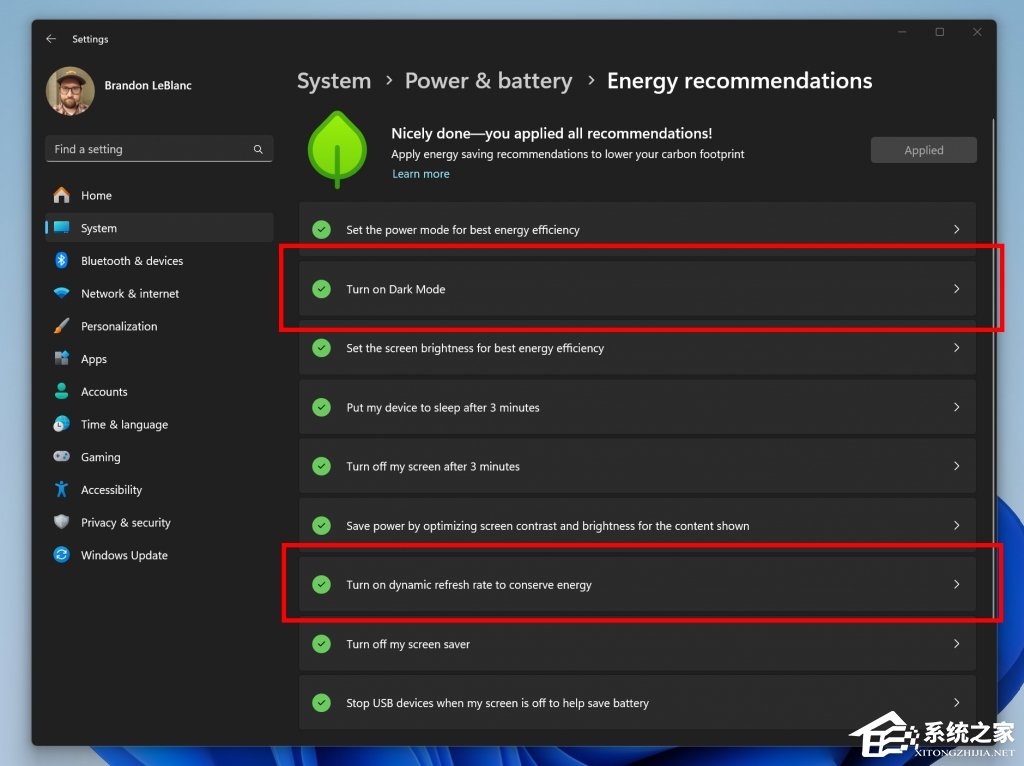 我们在“设置”>“系统”>“电源和电池”>“能源建议”下添加了 2 条额外的能源建议,用于打开暗模式并调整刷新率以节省能源。
