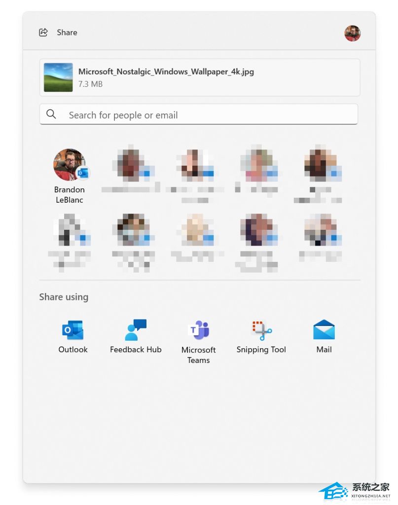 更新了 Windows 共享窗口,添加了新的搜索框、更多建议联系人和 Outlook 共享。