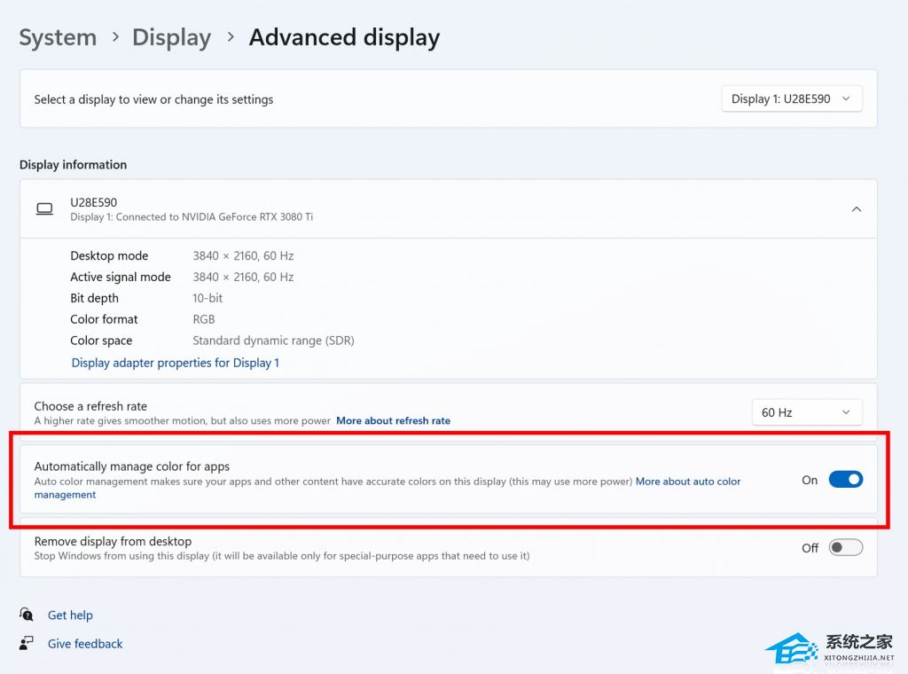 要打开 ACM,请转到 “设置”>“显示”>“高级显示”,选择正确的显示并打开“ 自动管理应用程序颜色”。
