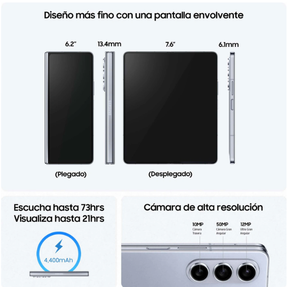 根据宣传图信息显示,三星Galaxy Z Fold5手机配备了一块6.2英寸的外屏和一块展开状态下为7.6英寸的内屏。这款手机在折叠时的厚度为13.4毫米,展开时的厚度为6.1毫米,显示了其出色的折叠设计。