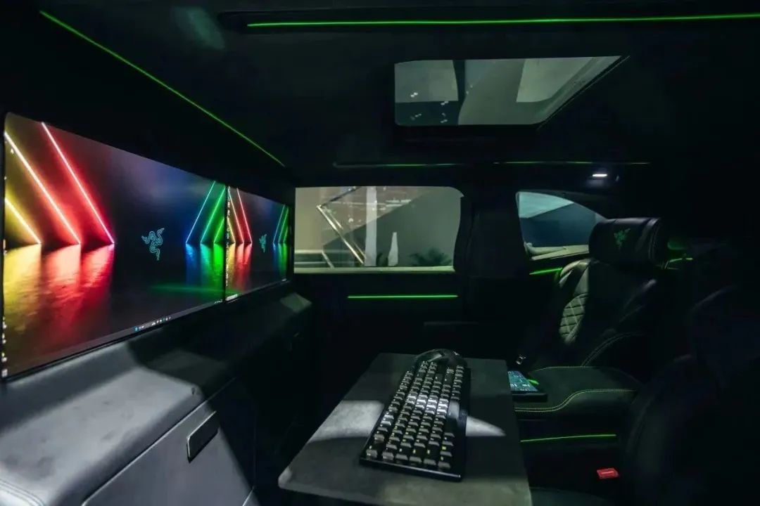 这种电竞风格不仅外显于形,还延续到了车内。其采用雷蛇全家桶旗舰设备,在硬件系统、座椅舒适度和座舱氛围等各方面都做到了“满配”,包括超强的灵刃游戏笔记本电脑、雷蛇独创的Chroma幻彩灯光系统、THX空间音效以及多种外设支持等等,打造出沉浸式电竞氛围舱。它仿佛将游戏中的车直接开到了现实中,让玩家们随时随地都能任性开黑。